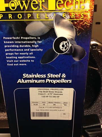 Powertech Stainless 4 blade, 18 pitch, 14.25 Diameter. This was an extra prop I had for my 1860 Angler. Been used one time, and then taken off for a spare. I haven't needed it, so I am selling it. still in the box. Perfect condition. $275.