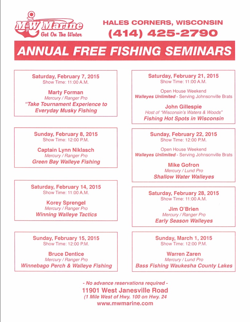 | Jump to page : 1 Now viewing page 1 [25 messages per page] Walleye Fishing -> General Discussion -> MW Marine Free Seminar Schedule, Hales Corner, WI |