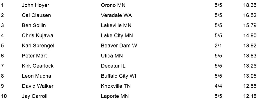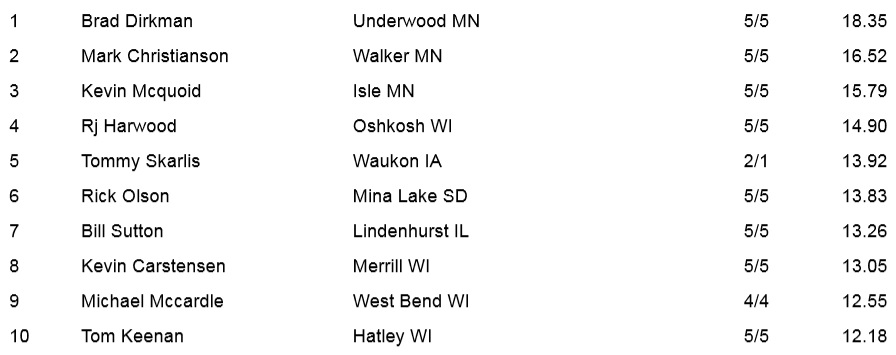 Brad Dirkman Leads on the Pro side with 18.35 pounds. Mark Christianson is in second with 16.52 pounds and Kevin Mcquoid is in third with 15.79 pounds.