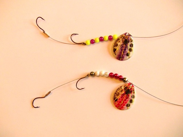 Location: Essexville, MI./Saginaw Bay. | I love Tommy's Custom designs and more Durable Paint jobs. They have always been the icing on the cake for me in many of my own versions of spoon and crawler harnesses. I like the Power Pro idea giving the crawler more flexibility behind whatever you tie it behind. But find plastic coated wire to my liking as well. It will kink on rare occasions, but bends back into shape quit easily. I guess the key is the pound test you use if using either one. To much flexibility can cause twist and create unwanted knot trouble as well behind some items either twisting or spinning to much or fast. The real charm, is that the spoon versions work when either trolled dead slow or at MACH 1. PS. Love your new French Artist look Tommy.