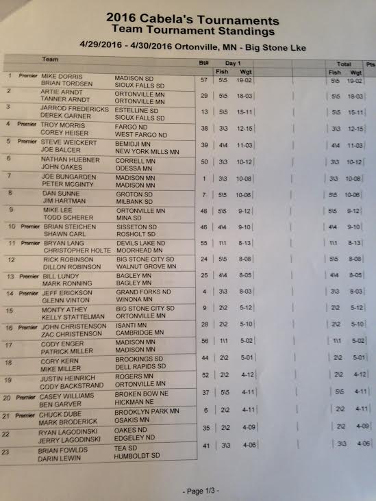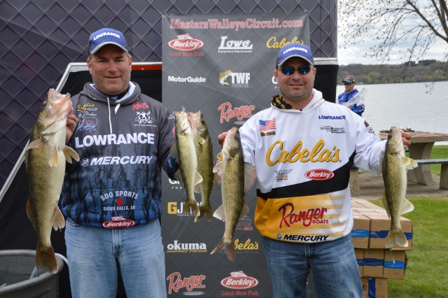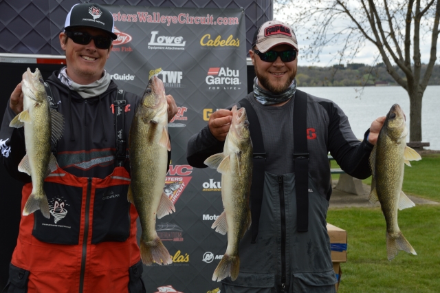 Location: Rhinelander | Mike Dorris & Brian Tordsen are in the lead after day one of the Cabela's Masters Walleye Circuit on Big Stone. The team weighed 5 fish for 19.02 lbs and held onto the biggest fish spot as well with a 9.01 pounder. Artie Arndt & Tanner Arndt are not far behind headed into day two with 18.03 pounds. Holding onto the third place spot for day one is Jarrod Fredricks and Derek Garner with 15.11 pounds.