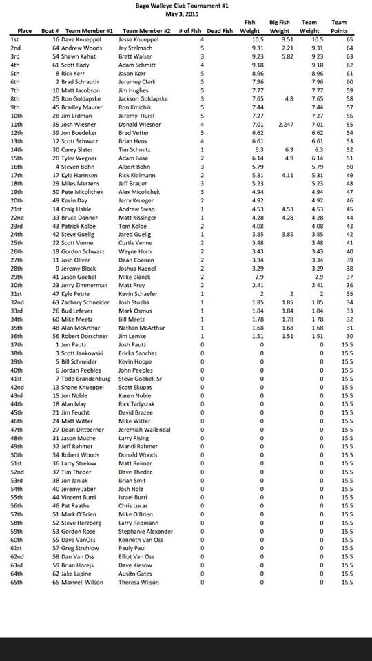 The tough fishing conditions persisted as anglers had to really work to catch fish. Team Knueppel took first place with a 10.5 pound bag, with the fish being taken on trolled crankbaits. Many undersize fish were reported by tournament anglers with cold, windy conditions making fishing tough.