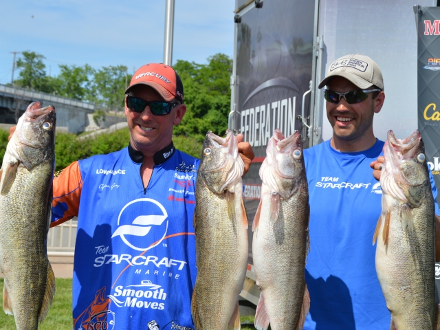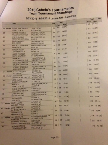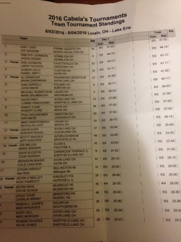 Location: Rhinelander | Gary Zart & Joe Nadzam are in the lead after day one of the MWC on Lake Erie. They brought in a huge 47.02 pound bag. Timothy Johnson & Jason Zsebik are just a few pounds behind with 44.14 pounds and Dan Johnson & Larry Rhoads sit in third with 43.13 pounds. Top 20 Day 1 1st- Gary Zart Joe Nadzam 2nd- Timothy Johnson & Jason Zsebik 3rd- Dan Johnson & Larry Rhoads 4th- Joseph Zelei & Daniel Smith 5th- Ali Shakoor & Brian Zarembski 6th- Sam Cappelli & John Snow 7th- Michael Robertson & Mark Brumbaugh 8th- David Frey & Lonnie Hanchosky 9th- Randy Cline & RFobert Cline 10th- Paul Holzheimer & Dan Niese 11th- Mike Knippenberg Nicholas Zart 12th- Jason Kopf & Rodger Riggs 13th- Scott Rhodes & Jeff Koester 14th- Joe Miller & Mark Barden 15th- Dave Kleszyk & Todd Rairigh 16th- Brandon Baker & Cole Carlson 17th- Ethan Wright & Ken Rice 18th- Kevin O'Malley & Rick Parrott 19th- Kevin Dahl & Steve Stack 20th- Ronnie Rhodes & Katie Jones Attachments ---------------- DSC_0600.jpg (280KB - 198 downloads) DSC_0398.jpg (275KB - 168 downloads) DSC_0536.jpg (280KB - 186 downloads) index_001.jpg (113KB - 184 downloads) 2_001.jpg (118KB - 183 downloads) index3_001.jpg (98KB - 195 downloads) | ||
