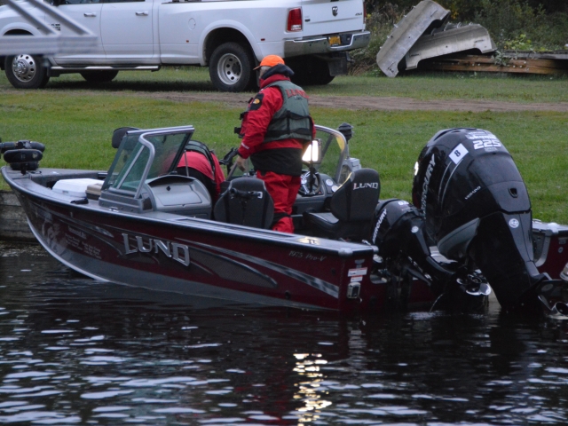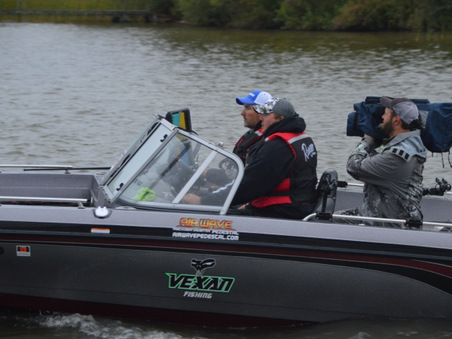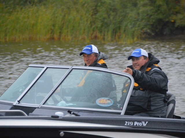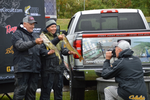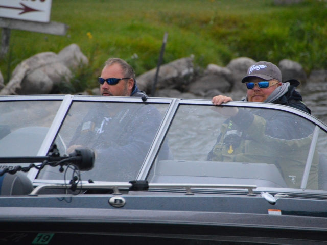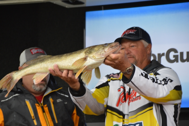 Location: Rhinelander | As soon the the day 1 weigh in started so did the rain. Lots of fish were caught today. Carl Holten and Mickey Stuefen are in the lead with five fish weighing 17.01 pounds. Tommy Skarlis & Jeff Lahr are close behind with five fish at 16.08 pounds and finishing out the top three is Spencer Deutz & Ron Deutz with 15.04 pounds.