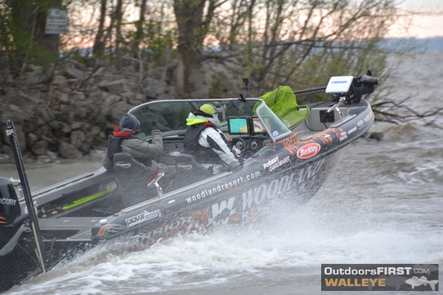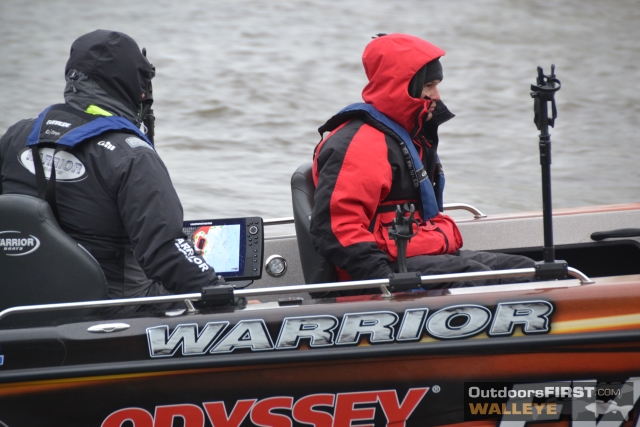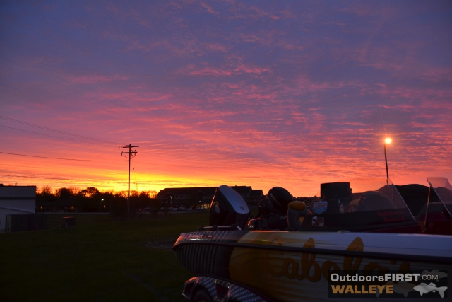 I believe the sea-faring folk of old had a saying about a red sky in the morning not being a harbinger of good weather. While the morning came without the promised rain, it did have close to a 30 degree drop in temperature with radar showing rain showing up sometime around 9am. Anglers talked of the possibility of 2 inches of rain today, along with a big wind out of the east having an effect on their game plan. Many said they would stick with successful techniques from day 1 yet have an open mind to move/change if needed. Boat control will be on their minds too, with river locations and their somewhat sheltered nature becoming more and more viable. Stay tuned to walleyefirst.com and our social media outlets for coverage of the weigh-in during the forecasted icy monsoon.
