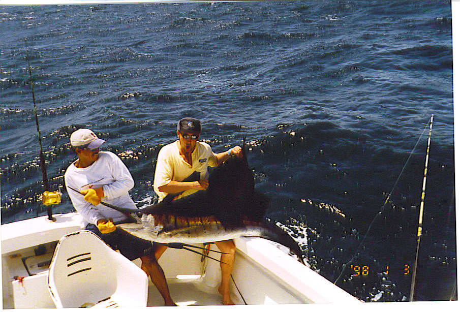 Yes, we were trolling dead Ballyhoo at around 5 MPH. I fought her for an hour and she sounded, I was using a 30 series Diawa reel with 30# mono and she wouldn't budge. The Capt. pulled ahead about 200 feet and let the reel take drag, then he backed back up to the fish, held the line in his teeth and retied the line to a heavy duty Penn with 100# mono so I could get som leverage. Finally she came up. What a day, 10 sails on 5 in the boat, 2 went about 160# 2 about 120 and "the small one was 100 or so. I've caught dozens of sails in Fla that were around 40-50#. But nothing like these, these fish were like marlins. I have some "aerial" photos that I was going to post on here but it doesn't seem like there's much interest. If you want to see them e=mail me at [email protected].