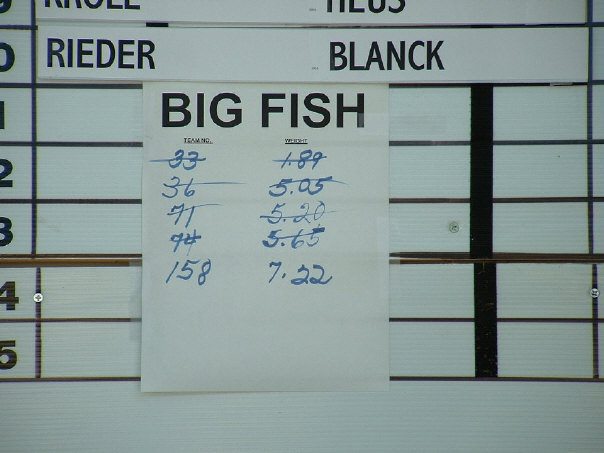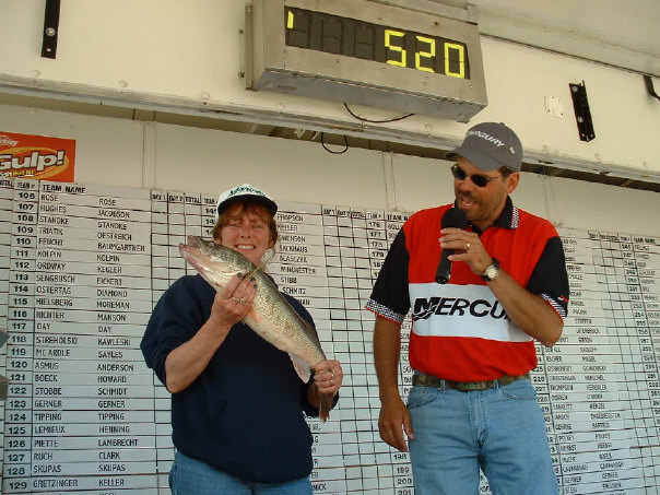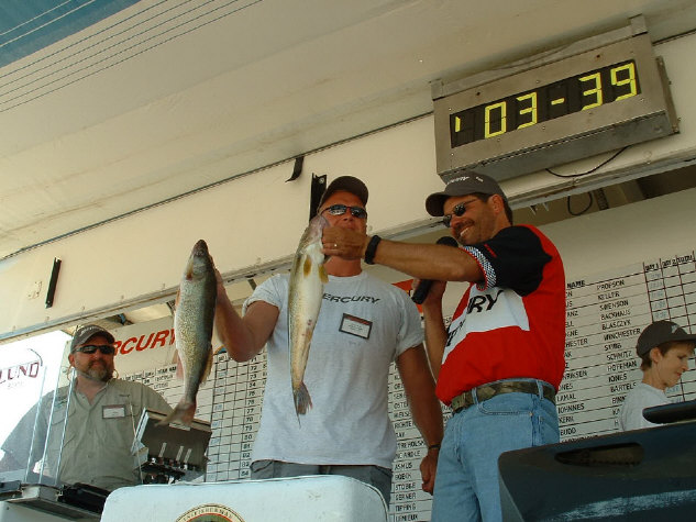 Location: Rhinelander | The bite was pretty tough for many, but those who figured out the changes brought on by the high water did very well. The weather broke from cloudy and cool mid day to warm, calm, and sunny, with temps crowding 80 degrees. Big fish for the day was 7.22, with a couple in the 5 pound class second and third. Limits increased from flight one to flight four, but only six anglers broke the 20# mark today. Here are the results reproduced with the permission of TFM Promotions. See all the data there at www.fishtfm.com. TFM Promotions Ltd. proudly presents the 2004 Mercury National Saturday Standings (Top 262 Teams) Tournament Stats Place Name City , State Team Number Total Weight 1 Bob Sengbusch Tim Eickert Brillion, WI Brillion, WI 113 23.75 2 Karl Federman Luke Staehler Fond du Lac, WI Byron, WI 36 23.69 3 Fritz Peterson Mark Van Hefty Sturgeon Bay, WI Appleton, WI 245 22.43 4 Cary Literski Mark Ramge Waupaca, WI Oshkosh, WI 37 22.34 5 James Chatterton Patrick Higgins Fond Du Lac, WI West Bend, WI 83 22.12 6 Doug Kreger William Needles Hartford, WI Necedah, WI 158 20.30 7 Scott Gerner Shane Gerner Chilton, WI Chilton, WI 236 19.64 8 Jason Muche Ryan Standke Neenah, WI Oshkosh, WI 1 17.19 9 Ronald Roggow Kevin Roggow Berlin, WI Berlin, WI 242 16.90 10 Gary Falkowski George Wlodarski Caledonia, WI Orland Park, IL 238 16.04 11 Kevin Blanck Don Lisowe Malone, WI Chilton, WI 183 16.02 12 Shawn Wendt Duwayne Patt Van Dyne, WI Van Dyne, WI 90 15.53 13 Jeff Jones Kevin Jones Eden, WI Eden, WI 150 15.45 14 Rick Zachowski Craig Campbell Milwaukee, WI Green Bay, WI 239 15.27 15 Paul Ferch Brian Smit Brandon, WI Brandon, WI 42 15.11 16 Mike Day Troy Day Oshkosh, WI Oshkosh, WI 117 15.06 17 Brian Pluim Harlan Pluim Brandon, WI Waupan, WI 95 14.94 18 Troy Saunders Keith Daniels Menasha, WI Fond du Lac, WI 76 14.71 19 Todd Mueller Dennis Doro Appleton, WI Neenah, WI 186 14.65 20 Jon Janiak Tom Stibb Fond du Lac, WI Fond du Lac, WI 147 14.19 21 Brian Sabel Brad Sabel Oakfield, WI Oakfield, WI 88 14.05 22 Todd Ritzke Dan Brantmeier Kaukauna, WI Sherwood, WI 28 13.93 23 Gordon Schwarz Brett Wilkens New Holstein, WI Kiel, WI 31 13.88 24 Joe Janiak Tim Benedict Fond du Lac, Wi Fond du Lac, WI 170 13.74 25 Mark Thiel Gregory Stratz Fond du Lac, WI Fond du Lac, WI 287 13.73 26 Scott Gruett Paul Gruett Hilbert, WI Appleton, WI 99 13.56 27 Tom Walters Steve Weston Campbellsport, WI Fond Du Lac, WI 294 13.46 28 Rick Kerr Ted Karow Depere, WI Oshkosh, WI 153 13.41 29 Gary Hettenhaus Mark Schommer Fond du Lac, WI Fond du Lac, WI 96 13.15 30 Carl Althaus Bruce Keller West Bend, WI Campbellsport, WI 142 13.13 31 Tommy Kemos Bob Newton Oconomowoc, WI McFarland, WI 200 13.06 32 Jason Homulos Brian Christenson Hustisford, WI Hartford, WI 282 12.61 33 Harold Hinz Heath Hinz Van Dyne, WI Van Dyne, WI 22 12.56 34 David Gerner Michael Gerner Green Lake, WI Omro, WI 123 12.35 35 Mike Hildahl Erek Nelson Oshkosh, WI Appleton, WI 269 12.32 36 Josh Wiesner Jason Wiesner Campbellsport, WI Campbellsport, WI 13 12.27 37 Todd Rieder Mike Blanck Mt Calvary, WI Malone, WI 300 12.23 38 Brad Escher Nick Pingel Chilton, WI New Holstein, WI 224 12.20 39 Tim Winchester Garry Winchester Oshkosh, WI Oshkosh, WI 146 12.11 40 Daniel Steffen Dale Steffen New Holstein, WI New Holstein, WI 220 12.07 41 Pat Schuette Jerry Ruffolo Manitowoc, WI Manitowoc, WI 267 11.90 42 Robert A. Konstanz Jon Swenson West Bend, WI West Bend, WI 143 11.86 43 Tod Asmus Brian Anderson Fond Du Lac, WI Fond Du Lac, WI 120 11.79 44 Jim Hughes Matt Jacobson Oshkosh, WI Oshkosh, WI 107 11.76 45 Randy Kolpin Dean Kolpin Keil, WI Saxon, WI 111 11.64 46 Steven Wiskow Bill Morgan Fond Du Lac, WI Fond du Lac, WI 66 11.63 47 Joe Minnema Pete Minnema Markesan, WI Butternut, WI 92 11.61 48 Rich Stadler Chris Mueller Oshkosh, WI Oshkosh, WI 296 11.51 49 Dick Schiefelbein Irene Schiefelbein Sheboygan, WI Sheboygan, WI 208 11.49 50 Brian Wolter Dale Walker Fond du Lac, WI Markesan, WI 57 11.47 51 Ron Triatik Steve Oestreich Van Dyne, WI Fond du Lac, WI 109 11.41 52 Dale Howard John Geiger Larsen, WI Neenah, WI 212 11.36 53 Jeremy Bohn Albert Bohn Fond Du Lac, WI Kewaskum, WI 259 11.20 54 Romen Zelhofer Jr Andy Knumenauer Oshkosh, WI Oshkosh, WI 279 11.19 55 Larry Herbst Ann Herbst Van Dyne, WI Van Dyne, WI 233 11.18 56 Rodney Dewitz Tim Shady N Fond Du Lac, WI Oakfield, WI 84 11.11 57 Perry Prochnow Rick Suess Brillion, WI Loveland, CO 258 11.11 58 Matt Kissinger Bruce Donner Cascade, WI Oshkosh, WI 137 11.08 59 Wayne Freund Mark Schumacher Fond du Lac, WI Fond du Lac, WI 80 11.03 60 Dave Wirth Wes La Fever Berlin, WI Marinette, WI 278 10.96 61 Jeff Gehrke Steve Bartels Oshkosh, WI Ripon, WI 231 10.94 62 Dennis Butz Scott Allen Suamico, WI Green Bay, WI 47 10.62 63 Joey Diener Alan Diener Brillion, WI Brillion, WI 134 10.61 64 John Walters Shawn Roeseler Chilton, WI Fond Du Lac, WI 73 10.52 65 Steve Volz Todd Konen Malone, WI Hilbert, WI 132 10.51 66 Dave Schmitz Herbert Shady Jr. Fond Du Lac, WI Fond Du Lac, WI 190 10.47 67 David Bloch Bill Coats Ripon, WI Ripon, WI 2 10.42 68 Ed Bowden Bruce Van Schyndel Larson, WI Kaukauna, WI 204 10.37 69 Bill Menees Bob Talley DeKalb, IL Lindenwood, IL 252 10.26 70 George Kleinschmit Jeff Gibson Oshkosh, WI Oshkosh, WI 222 10.13 71 Jerry Tipping Kay Tipping Milton, WI Milton, WI 124 10.07 72 Tim Knoespel Greg Karch Brillion, WI Oshkosh, WI 98 10.06 73 Craig Lemieux Steve Henning Neenah, WI Appleton, WI 125 9.94 74 Tripp Ahern Gary Engberg Fond du Lac, WI Mazomanie, WI 87 9.91 75 James Bauer Mark Damro Appleton, WI Kaukauna, WI 289 9.87 76 Carl Rose Gordon Rose Fond du Lac, WI Fond du Lac, WI 106 9.79 77 Steve Renderman Dave Henning Jr. Fond du Lac, WI Fond du Lac, WI 168 9.79 78 Jeff Jessogne Randy Blasczyk Appleton, WI Green Bay, WI 145 9.78 79 Dan Zwick Bruce Uitenbrock Wrightstown, WI Greenleaf, WI 221 9.75 80 Al Streholski Richard Kawleski Fond du Lac, WI N. Fond Du Lac, WI 118 9.72 81 Joe Cartwright Art Walters Appleton