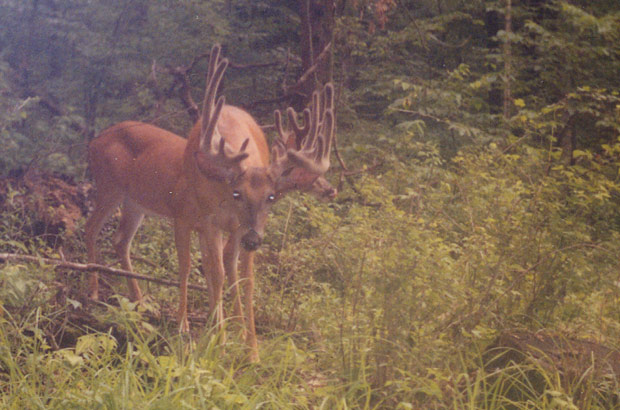 Thought everyone here might enjoy this picture taken by a gamecam at my buddies farm down here in SE Minnesota in July. There is a small buck behind the larger one.