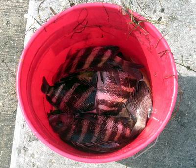 Member Posts: 714 | Say, those black and white stripped fish in the bucket are "Sheepshead" (salt water version) and are great to eat. Very sweet flavored. Talk about hard mouths! Those things crush anything from crabs to oysters when they eat, and put up a great fight. When I was growing up in S.C. we would catch them up to 10-12 pounds. | ||