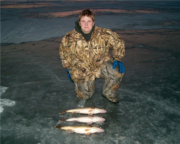 So I see this fish come into the hole, but Jeff isn't getting down on one knee. All of a sudden he reels down closer to the fish and Slingshots him out of the hole like a trident missle being launched from it's submarine. The fish hits the ice like a 300 pound Tuna in those old commercial fishing videos, thrashing around more in shock that he's been blasted out of his element than anything else. I'm laughing my butt off at the sight, as Jeff is now kicking the walleye away from the two 10 inch holes like Gordy Hull foot feathering the puc for a slap shot. The whole day was full of laughs and we ended up going 3 for 7, with the dead rods giving us fits for setting the hooks today.