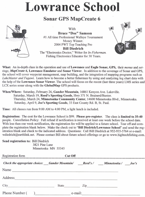 | Thank you for posting the School schedule. It has been very interesting and a work in progress to teach an audience of varied skills. I do some very technical demonstrations on computer software when I show how easy it is to create your own maps. If you don't have computer skills it is a view of the future. Bill and I try very hard to explain everything from basic sonar and GPS to transferring your waypoints to the computer in methods the student understands. Our visuals really help to demonstrate our points. A large part is questions and answers. Bill and I have found we enjoy them and hope to do them again next year. Doc | |||