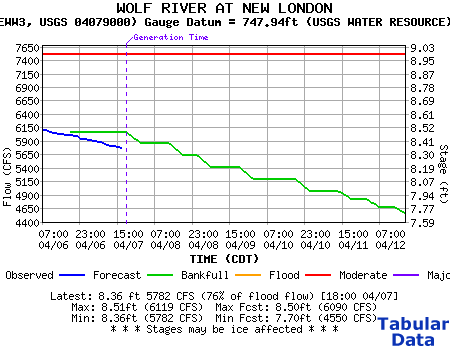 | I also do not put great stock in to the idea that the lowering of water on Winnebago does much to the water level, say in New London. We are quite a few feet in sea level I beleive higher then the lake so imagine the amount of water that would have to be held on the entire system in order for our water here to be even a foot higher. Our water levels here (IMHO) are a direct result of water tables, springs and the flow of the tibutaries feeding the Wolf joining with the flow from the headwtaers. | |||
