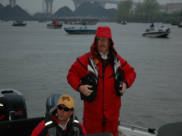 | The rain and wind made for a difficult day on the Bay, but the bite was hot and the big fish plentiful. Tuffy/Mercury Pro Pat Schuette came to the stage with a 36 pound 6 ounce bag on top of day one's 29-13 to take a slim lead over second place Patrick Neu. Glen Chenier was a bit down from yesterday with 28-1, but held on to fourth despite a HUGE 40 pound 12 ounce limit taken by Gordy Powers, moving him up into 5th.