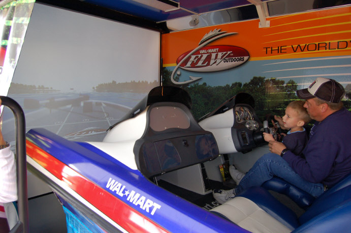 Location: Rhinelander | The FLW Wal Mart Championship isn't just about Tournament fishing, it's about equipment, boats, motors, sonars, trout pond fishing, and entertainment for the kids onsite at the free expo next to and inside the huge weigh in facility. Sponsors have displays onsite, with lots for the kids to do as Dad looks at his dream motor, boat, sonar, or rig. One of the most popular displays is an inreractive 'drive the Ranger boat' simulator.