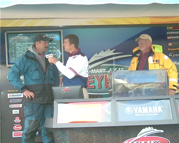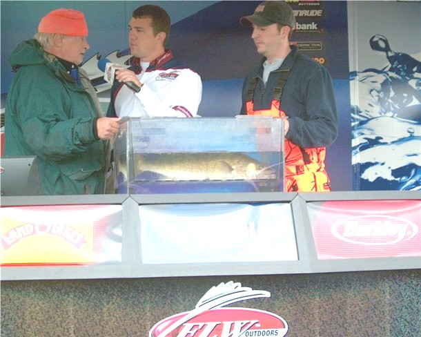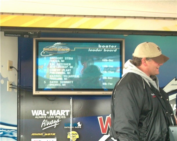 I was indeed impressed this afternoon watching 2/3 or more of the field of 47 entries as they came to the scales at the FLW legue event today in Bay City. Even though there were few monsters, I'd say at least that many entries had their 5 walleye tournament limit. And even though many, many were in that "Just keeper" size frame, everybody seemed to say they caught a lot more fish then they needed on top of the ones they kept. Harnesses and meat took most of the fish with spoons being mentioned a few times. This spells great things to come in my mind. Anyway, Gregory Stola from Fenton and his ameture partner took first place with a weight of 16.9 pounds in some rough conditions. Good work guys. Heres some pictures. Check out #2, its our own Tom22 (I Think).