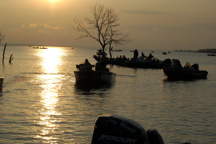 61 degrees and moderate winds at dawn with sunny skies and winds in the tnnes meant a good bite on Day Two according to several of the Pros I talked to this morning. The winds are going to be moderate, and temps topping in the 70's will make for a beautiful day on the water.