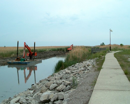 The contractors obligations under their contract with the township, is to remove 2,500 cubic yards of sediment from the cut. They figured they would start near the end of the cut, where the cement walkway ends. They would dredge the cut 3 feet deep and 30 feet wide well out into the bay, while making barriers on it's east side to prevent wind-fill. They would guarantee their work for 3 years. They were told that the cut was still 3 feet deep out to that point, so their sediment barge would float down the cut to that negotiated starting point.