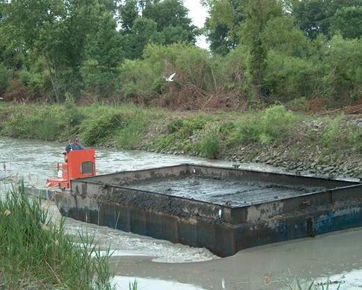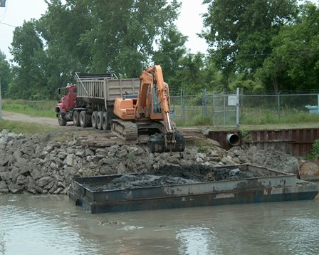 Well, when they tried to launch their barge at the ramp, she bottomed out in the actual 2 feet of water that is there. This meant that they had to dredge ahead as they went, to even get to the negotiated starting point in the cut. This sediment of course was/is counted against the 2,500 CY they contracted to haul away. You can see by the picture that they are now where they thought they were originally going to start, and have hauled roughly 1,000 CY of sediment so far. They have however dredged 4 feet deep and 35 feet wide.