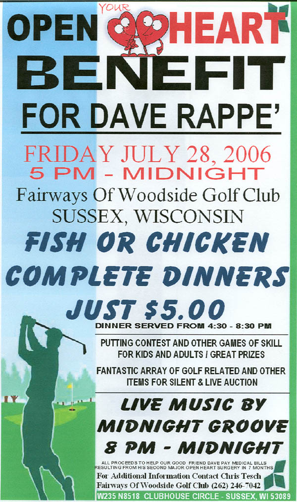 | For those in SE Wisconsin who are interested, there is a benefit dinner/dance for my friend Dave Rappe who had 3 "proceedures" including TWO major open heart surgeries in 7 months. Looks like problems figured out, but lost LOTS of work time from his 3 jobs. Complete chicken or fish dinners will be served at Fairways of Woodside Golf Course in Sussex for just $5. There will also be a putting contest plus some other contests and silent auction items. He works at Golf Galaxy and the golf course mentioned so there will be a lot of golf related prizes that should all go at bargain prices.