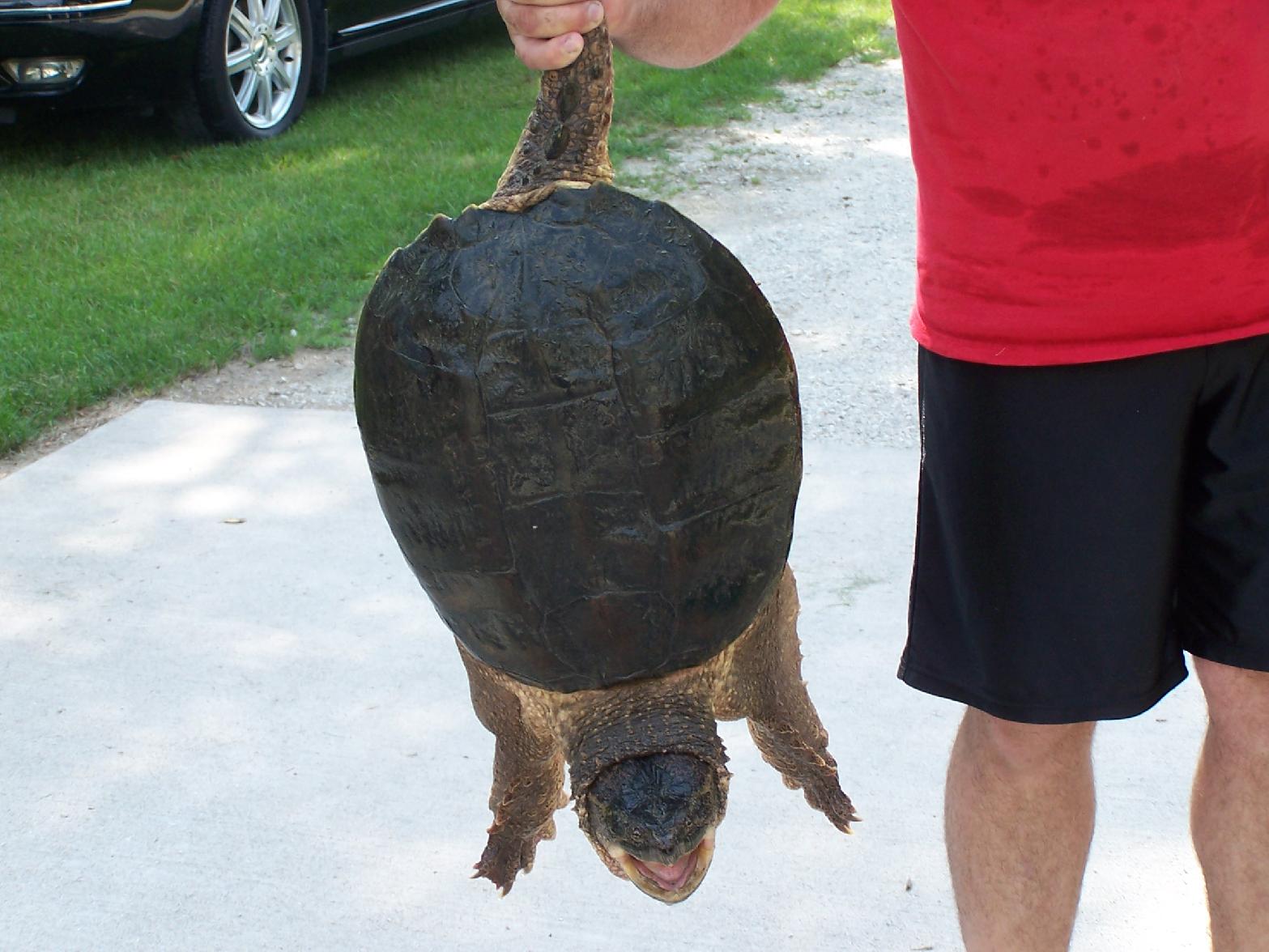 This was one of the biggest snappers I have seen. I picked her up as she was crossing a gravel road by my house. I presume she went and layed her eggs because she was headed back to the creek. She weighed 35 lbs. and the shell was 18" across. Although my taste buds were salivating I went and put the old girl back it the creek.