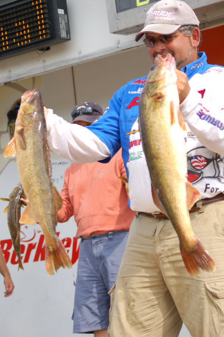 Member Posts: 1382 | The wind again was a deciding factor for many of the Pros today during Day Two of the PWT regional on Bays De Noc. Many anglers came in soaked and a bit beat up from a 20 or more mile run in 4' seas. The heavy seas didn't bother Pat Neu and Todd Riley much, as Pat weighed a 22.49# basket to take the lead followed by 'Iron Man' Todd Riley with a 23.56# basket to hold second at the end of Day Two. Tom Gatzke put 18.92# in the boat to maintain third. Keith Kavajecz had another great day and is holding down 4th place going into the final day. Keith has cemented a berth in the Championship with his weight so far, as has Todd Riley. Bill Ortiz pulled a 26.01# basket just missing the heavy weight of the tourament posted by Bob Probst Jr yesterday by less than a pound, vaulting into 5th. Courts and Kuzdzal posted weights over 20# to hold a top ten position, and Fairbairn, Brumbaugh, and Gofron held their own with baskets in the middle teens to round out the top ten. The USCG visited today warning of seas the might be near 4' to 5' tomorrow morning, possibly building to 7' or more by afternoon. Stay with WalleyeFIRST in the early morning for a report on conditions on the big pond and the PWT's decision if Day Three looks like small craft warnings will be issued. There was talk onstage today about the big fish 'reef bite' not providing the slots needed for a good basket, so many of the Pros are moving around quite a bit. Cranks, spinner rigs, and even a couple Pros fishing spoons have been the patterns discussed up to now. Attachments ---------------- DSC_0081.JPG (91KB - 107 downloads) DSC_0015.JPG (91KB - 109 downloads) DSC_0068.JPG (77KB - 139 downloads) DSC_0112.JPG (87KB - 136 downloads) DSC_0101.JPG (86KB - 131 downloads) | ||