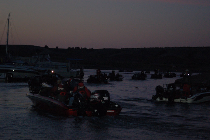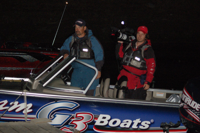 Warm temperatures, partly cloudy skies, and calm winds under a Harvest Moon greeted the Pros and their Cameraman as they powered their Ranger, G3, and Polar Kraft Evinrude/Yamaha rigs out of the Spring Creek Marina Harbor at 7:30 this morning.
