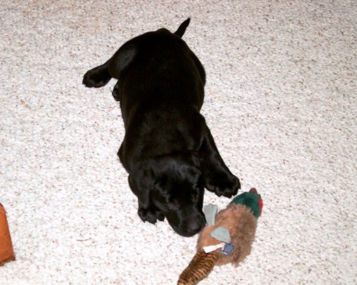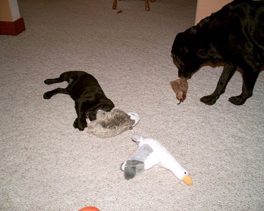 Only been 3 days and she's already house broke and helping Otter with some of his chores, like brining the wife her slippers when she gets home in exchange for a treat. Wife taught her to set patiently by the treat drawer after she comes in from doing her duty. I'm working with her on sit, stay and retrieve in the living room. But it's hard, being Otter still loves that game as well, and often reaches the toys before she can and the tug of war begins. He's also starting to like Abby, and wrestles with her now quite often. My buddies Rooster Ranch opens in August, hopefully by October Abby will be flushing and retrieving.