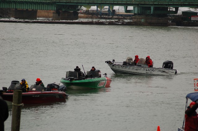 Location: Rhinelander | The winds are down a bit allowing access to lake Erie today. Sony Reynolds announced the big water to be open this morning at about 6:00 AM. Sonny urged common sense and caution, as it is still going to be rough out there despite the overall decrease in wind velocity. Skies are to be cloudy, with rain and snow showers possible this afternoon as temperatures fall into the mid thirties. Winds now are out of the SW at 9, with 17 MPH winds forecast as a front moves out of the area. Gusts to 35 are forecast, but that looks to be late in the day. Here's the chart through 1 PM from Accuweather: Wind Speed 14 12 13 14 15 18 19 22 We will update throughout the day if the winds pick up. Waves yesterday were 9' average on Erie. Many of the Pros expressed concern over the rough seas yesterday moving the fish on the big water, due to very poor water clarity. None the less, many are headed out to check the conditions. Mercury/Lund Pro Ron Seelhoff said he will check the big water first, at least for a couple hours. Toyota Trucks/Evinrude Pro Pat Neu said he was haeding for the big water as well, but was concenred with the overall conditions. Attachments ---------------- DSC_0020.JPG (66KB - 110 downloads) DSC_0018.JPG (82KB - 98 downloads) DSC_0008.JPG (66KB - 95 downloads) DSC_0036.JPG (76KB - 98 downloads) | ||