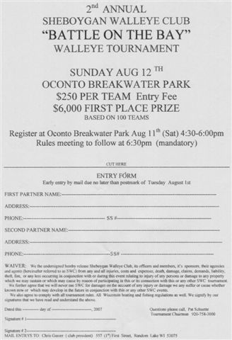 Member Posts: 2567 Location: Manitowoc, WI | Here is the entry form for those who wish to fish the Sheboygan Walleye Club's "Battle on the Bay". This year's event is scheduled for August 12th out of Oconto, WI. Rules can be accessed by email me at [email protected] or Pat Schuette at [email protected]. We're expecting a big turnout this year given that there aren't any events to conflict with and the awesome fishing on the Bay of Green Bay. Attachments ---------------- battle.jpg (30KB - 191 downloads) | ||