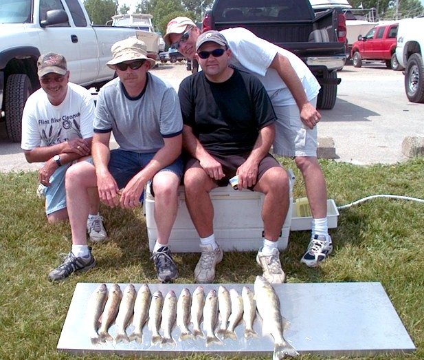 Location: Essexville, MI./Saginaw Bay. | Had a fairly good first charter day on the Bay today. The conditions were not what I'd call optimum. The Bay was flat as a pancake, hot muggy and the bugs were terrible. What radio or cell phone chatter I heard was not stellar either. I've seen this (Dead Sea) scenario to many times over the years on the Bay. During these times meat is often the only offering that produces, so I decided to run on one side with my latest invention the "Meat Freak". One of Daves Ka'Boom jointed crank baits minus the back section and replaced with a 2 hook harness. Ran them 2.8 MPH, 60 back, with 1/4 ounce tot's 70 back on the other side. Long story short, fished 1/2 a day lading 17 fish 13 keepers. New program tomorrow if the wind changes it's mind.