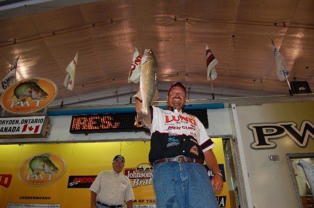 Location: Rhinelander | The fish weren't put off by the thunderstorms and the cold front according to the scales at day Two of the Dryden, Ontario, Wabigoon Lake PWT Super Pro. Mark Brumbaugh widened his lead, Doc Samson closed in on the leaders to hold third and Bill St Peter took over second on the strength of his 16.74# basket. Rick Olson hold a strong 4th. West winds and sun are the call for tomorrow, which should be great for this system's walleye bite. Watch for the morning WalleyeFIRST images and video tomorrow mid morning! Attachments ---------------- Brumbaugh Leads.jpg (77KB - 160 downloads) St Peter 2nd.jpg (79KB - 168 downloads) Martin.jpg (80KB - 154 downloads) Scott Big Fish.jpg (93KB - 156 downloads) KK.jpg (77KB - 161 downloads) Doc Moves Up.jpg (78KB - 155 downloads) Roberta.jpg (62KB - 156 downloads) | ||