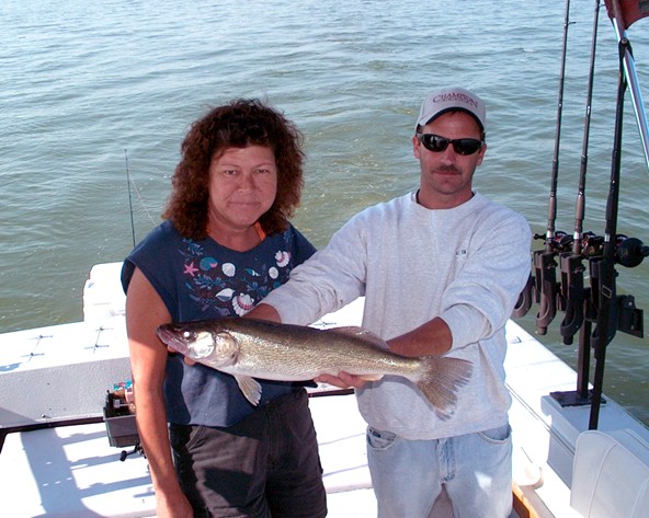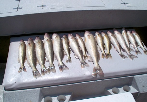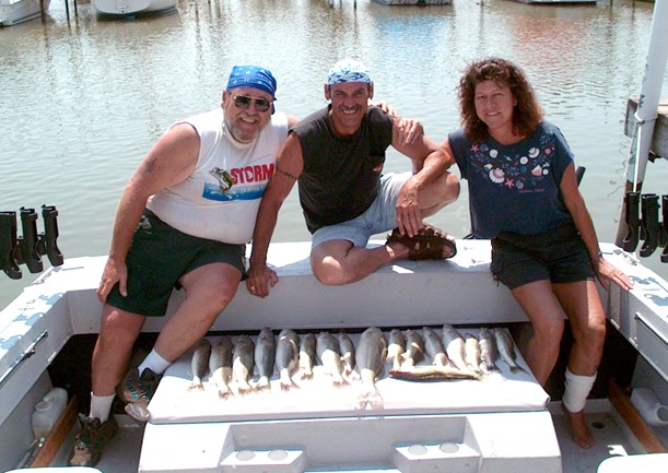 Took my Brother, Step Sister and a good friend out with me today for a half day fun trip on the Bay. Being with this company of people along with my friend (who is one of the better fishermen I know) allowed me to do a few things I cannot do (for the most part) with charter clients who are not used to or a complete strangers to the trolling program. One of these things (because of how flat it was on the water today) was it allowed me to zig-zag or do tight turns if I seen a likely pod of fish on my graph, knowing that people familliar with the pitfalls of this manuever, could keep the lines from becoming a "Cat in the Cradle" nightmare. Well, both the technique and the results paid off in spades today. Ever time I'd see some good marks on the screen, I'd jam the boat left or right and 2 or 3 rods would pop with fish, and most nicer fish today. The Eyeliminators and Gulp were doing it again today for the most part, with cranks filling in the gaps. We started fishing at 8:30am. Caught 19 fish, lost 6 and boxed 17 by 11:30am.