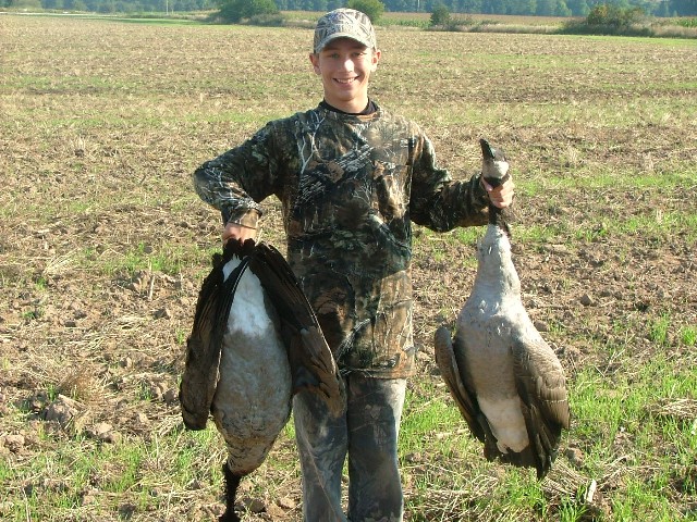 Member Posts: 2567 Location: Manitowoc, WI | My son Brandon and I spent the holiday weekend chasing around the golf course flying rats, a.k.a. Giant Canada Geese. So far the count is 7 with hopes for more, as I need about 20 or more to make goose sausage. Here's a photo of Brandon with a double we got including his first. Attachments ---------------- goosehunt 002a.jpg (168KB - 119 downloads) | ||