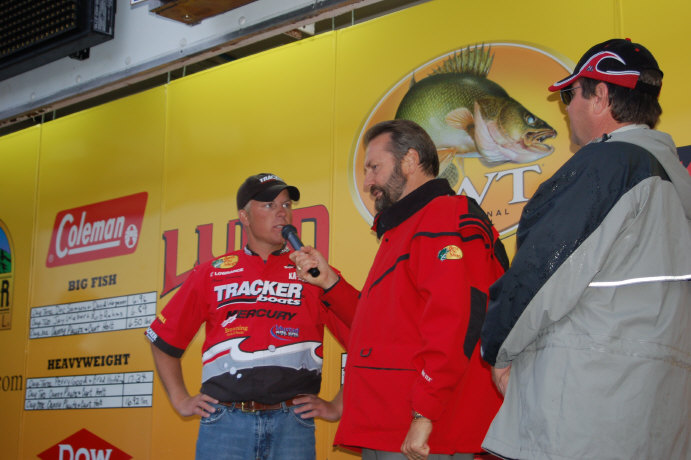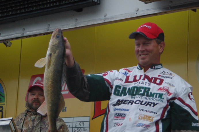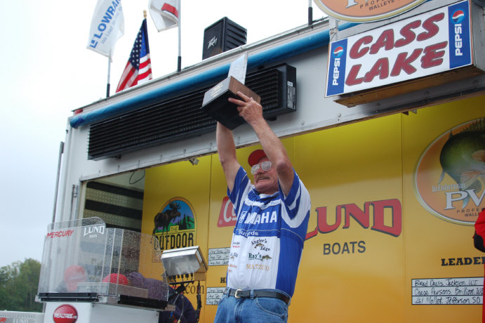 Location: Rhinelander | One of the true gentlemen of Professional Walleye Angling won the PWT Super Pro at Cass Lake, Mn. today, and won convincingly. Even on the stage with the $86,000.00 in cash and prizes and the 1st Place trophy in hand, he stated, " I was lucky!" It took way more than luck for Brad Davis, Skeeter/Yamaha/Stowmaster Pro, to put the three winning baskets together on a tough bite under rapidly changing conditions. He ground out the win rigging deep water, and it was obvious he AND his Co Anglers were enjoying the competition. He was fishing with two other Pros in the area days One and Two, but had a few more rigs in the area to beat on day Three. Brad held off a hard charging Gil Mollet to win by almost two pounds; a slot fish weight on this water. Lund/Mercury Pro Perry Good weighed the biggest basket of the event today at 17.34# to anchor third and big basket honors. Fourth went to Mark Gwizdala exactly 4 pounds off the winning pace. One of the big stories of this event was the 5th and 6th place finishes by Tracker/Mercury Pros Chase Parsons and his Dad, Gary Parsons. Chase beat his Dad by less than half a pound, but that was enough to make them both pretty happy. Gary Locked up the prestigious PWT Angler of the Year award for an unprecedented third time. It would not be an event if it were not for another top ten finish by Lund/Mercury Pro Mike Gofron. Crestliner/Mercury father/son duo Danny and Dan Plautz finished 8th and 10th, bracketing an 9th place Jay Weber to round out the Top ten. Attachments ---------------- DSC_0158.JPG (88KB - 94 downloads) DSC_0142.JPG (81KB - 102 downloads) DSC_0037.JPG (77KB - 100 downloads) DSC_0114.JPG (69KB - 115 downloads) DSC_0118.JPG (78KB - 115 downloads) DSC_0101.JPG (64KB - 116 downloads) | ||